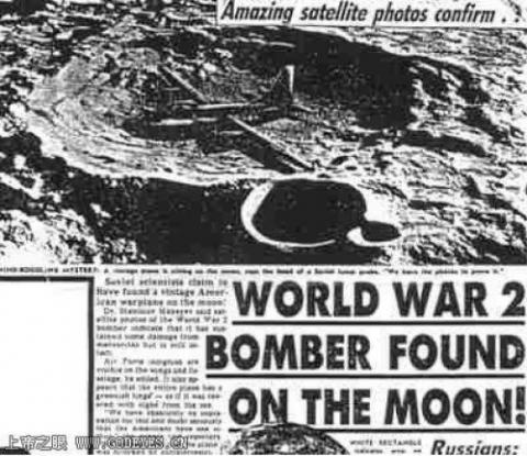 1987年3月蘇聯人造衛星從月球背面發回的傳真照片察看,有一架“二戰”時期的美制老式轟炸機,停放在月球的隕石坑邊,機身機翼都有明顯的美國空軍旗標,有人推測可能是外星人擄到月球上去的。蘇美兩國科學家曾打算成立一個特別小組進行秘密調查,可是蘇聯衛星于1988年7月再次掃瞄該地時,飛機已神秘消失,暗中監控的美國專家承認該架飛機是7月22日從月面失蹤的。