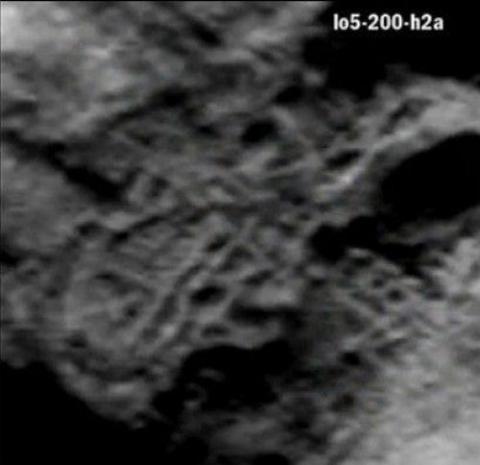 更為獨特的是另一座環形山,它們邊緣平滑,過于完整,環內呈幾何圖形,有仿佛是劃出來的平分線,在圓周的幾何中心部位,有墻壁及其投影。該山外側有一傾斜的坡面,其形狀有如完整的正方形,在正方形內有一個十字,把正方形等分成對稱的各部分。
