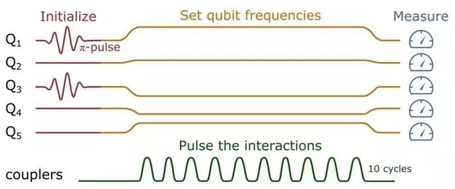 圖注:理想化的五量子比特設置,1號和3號量子比特初始設為激發態,經歷10次獨立的脈沖(量子門)然后得到最終結果。如果通過量子門的總時間比退相干時間短得多,就能夠獲得與預期相符的量子計算結果。