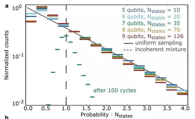 在量子計算領域,至少有一個最終狀態出現概率極低,而且同樣遵循特定的波特·托馬斯分布(porter-thomas distribution)。如果量子計算機狀況良好,就可以執行任意多次運算,再讀取結果查看是否符合預期的分布情況。