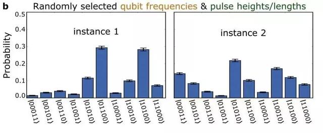 圖注:以10100開始實驗,并經過10次耦合脈沖(coupler pulse,比如量子運算),10種狀態并不會均勻分布,而且有極端高值。根據量子計算機結果,即可確定其是否符合預期的量子活動。