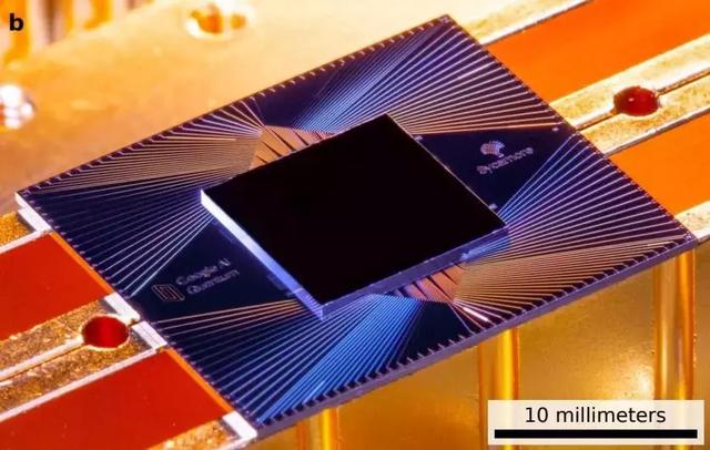 圖注:Sycamore處理器是一個包含54量子比特的矩形陣列(因為有一個量子比特無法使用,也就是一款擁有53個有效量子比特的系統),耦合器將鄰近的4個量子比特連結。上圖展示Sycamore芯片尺寸和顏色。