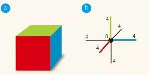 以下圖為例,a圖是一個(gè)正方體,假設(shè)這個(gè)正方體的邊長(zhǎng)是2普朗克長(zhǎng)度,那么每個(gè)面的面積是4個(gè)普朗克面積,這個(gè)正方體的體積是8個(gè)普朗克體積。因此,如果用量子自旋網(wǎng)絡(luò)來(lái)表示,那么就是b圖。圖上的這些數(shù)字,均與各個(gè)面對(duì)應(yīng)的自旋有關(guān)。