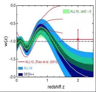 2017年我們利用最新的天文觀測,利用重子聲波振蕩,紅移畸變等等,重建了暗能量隨視線的演化歷史,可以明顯看到它不是等于負1,不是一個常數,而是隨著時間而演化的。
