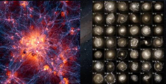 我們通過數字模擬得到的宇宙形成演化。右圖為數字模擬,已經和我們今天觀測到的星系非常接近了,有各式各樣形態的星系,橢圓星系、漩渦星系等等。因此,暗物質理論能夠很好的滿足今天的觀測。