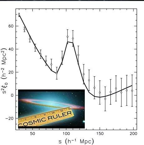 這個突起的位置非常重要,因為它來自早期宇宙的信息,反過來就可以推測宇宙的年齡、宇宙的膨脹速率、宇宙的組分等等信息。所以在宇宙學當中,我們把它叫做宇宙標準尺,也叫做重子聲波振蕩,是非常重要的一個物理工具。
