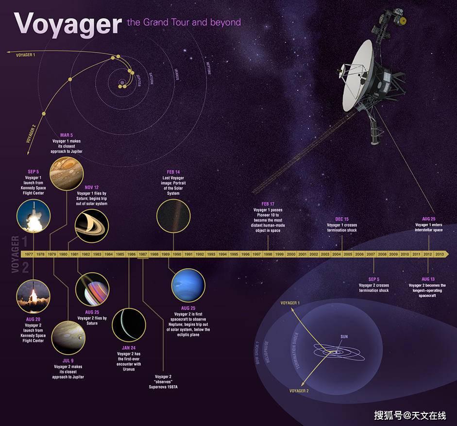 旅行者1號和2號在1977年相隔幾周發射,肩負著史無前例的“大游行”任務——遍游太陽系的各大行星。旅行者1號和旅行者2號都飛過木星和土星,但是,旅行者2號在這之后還疾馳過天王星和海王星。