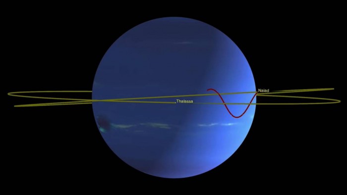 雖然兩顆衛星的軌道相對較近,但它們的不同軌道使彼此相距超過約2200英里。那是因為以更快的速度運行的Naiad被鎖定為一種波動的運動,以確保兩顆衛星永遠不會“偶遇”。無論兩顆衛星完成其宿主行星軌道的次數多少,其模式都保持不變,Thalassa在其軌道上平穩運行,隨著Naiad的軌道呈鋸齒形,在其在姊妹衛星的軌道上方或下方運行。