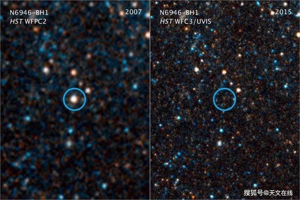 圖解:哈勃望遠(yuǎn)鏡拍攝的可見光/近紅外照片顯示,一顆質(zhì)量約為太陽(yáng)25倍的大質(zhì)量恒星已經(jīng)消失,既沒(méi)有超新星也沒(méi)有其他解釋。直接坍縮是唯一合理的候選解釋,也是已知除了超新星或中子星合并之外形成黑洞的一種方式。(圖源:NASA/ESA/C. KOCHANEK (OSU))