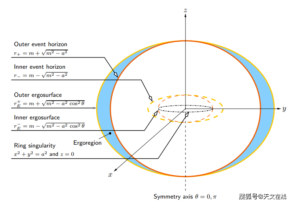 1. 在視界的位置并非只有一個(gè)解,一個(gè)旋轉(zhuǎn)的黑洞有兩個(gè)數(shù)學(xué)解:一個(gè)內(nèi)視界和一個(gè)外視界。