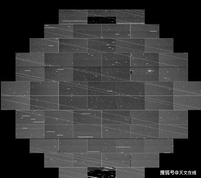 圖解:受星鏈影響的受損DECam幀圖,顯示了整個視野內的衛星軌跡。