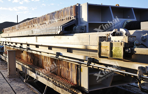 廂式壓濾機主要有五大部分組成:機架部分、自動拉板部分、過濾部分、液壓部分和電器控制部分。廂式壓濾機被廣泛運用于尾礦干排中,其優越性在于正壓、高壓強脫水,濾餅水分低,能耗少。使用廂式壓濾機處理尾礦后的濾液清澈透明,可達到環保廢水直接排放要求,過濾后干渣含水率達到8%以下,大大降低尾礦輸送成本及尾礦干堆的風險。