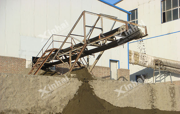 尾礦經渣漿泵輸送到水力旋流器進行濃縮和分級,水力旋流器的沉砂進入高頻高效脫水篩進行脫水處理,溢流則進入高效化改造濃密機進行濃縮處理。經高頻高效脫水篩處理過后的粗粒尾礦經皮帶運輸機運輸到料場堆存。其中,經高效化改造濃縮機濃縮處理過后的尾礦由渣漿泵輸送到廂式壓濾機進行壓濾處理,壓濾機的濾餅自卸到皮帶運輸機上,把細粒尾礦運輸到料場堆存。