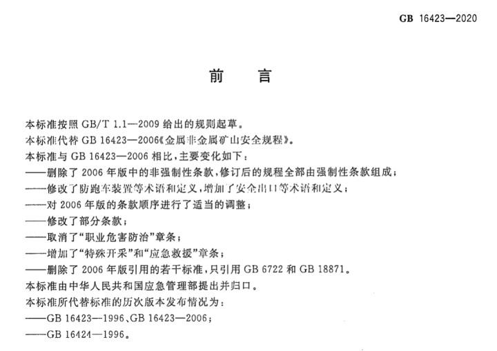 本次修訂總體上沿用了原標(biāo)準(zhǔn)的章節(jié)結(jié)構(gòu),主要集中在井下提升運輸、礦井火災(zāi)防治、供配電、通信、飾面石材開采等方面進(jìn)行了修改完善,同時加入了應(yīng)急救援和閉坑的相關(guān)內(nèi)容,重點修訂內(nèi)容有: