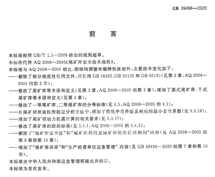 二是明確了《規(guī)程》的適用范圍。新制定的《規(guī)程》進(jìn)一步明確了尾礦庫定義:用以貯存金屬、非金屬礦山進(jìn)行礦石選別后排出尾礦的場所,排除了其他工業(yè)廢渣庫、電廠灰渣庫等。明確適用于中華人民共和國境內(nèi)的尾礦庫在建設(shè)、生產(chǎn)運行、閉庫、回采、安全評價等方面的安全要求,既包括技術(shù)要求,也包括管理要求。