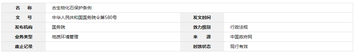 《古生物化石保護(hù)條例》已經(jīng)2010年8月25日國(guó)務(wù)院第123次常務(wù)會(huì)議通過,現(xiàn)予公布,自2011年1月1日起施行。