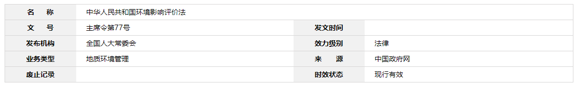 《中華人民共和國環境影響評價法》已由中華人民共和國第九屆全國人民代表大會常務委員會第三十次會議于2002年10月28日通過,現予公布,自2003年9月1日起施行。