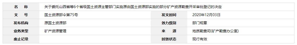 八、本決定自公布之日起施行,有效期5年。本決定公布前國土資源部有關礦產資 源勘查、開采審批登記權限調整的規定繼續執行。