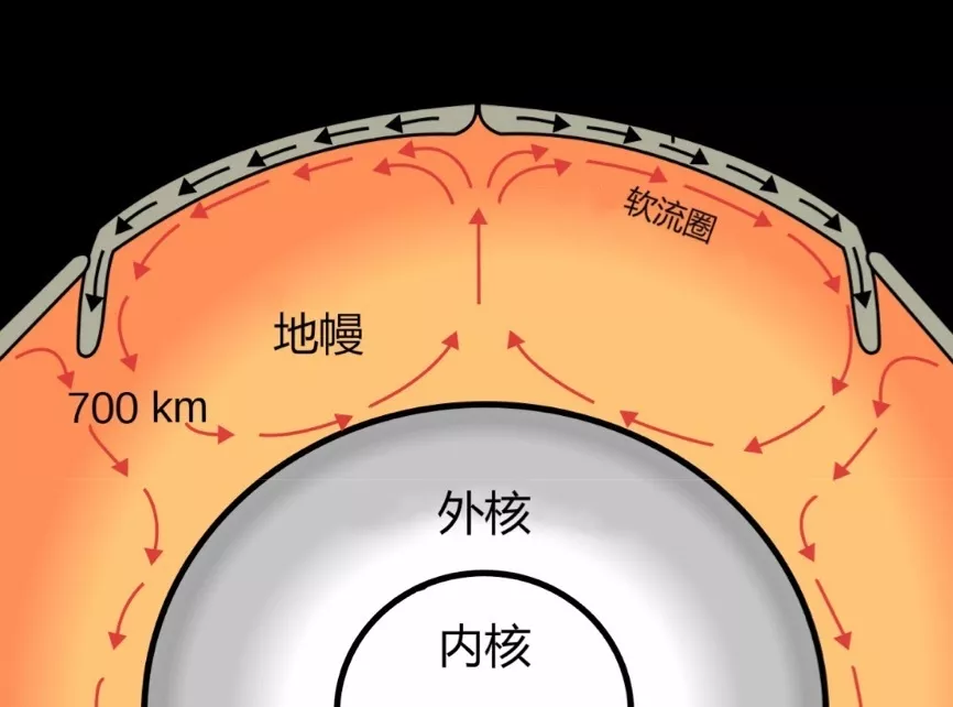 在以百萬年為尺度的地質年代中,我們可以把地幔看作超級厚的粘性物質,不是固體,也不是完全的液體,地幔的某些區域溫度較高,那么在地幔中是不是也存在類似的對流形式呢?