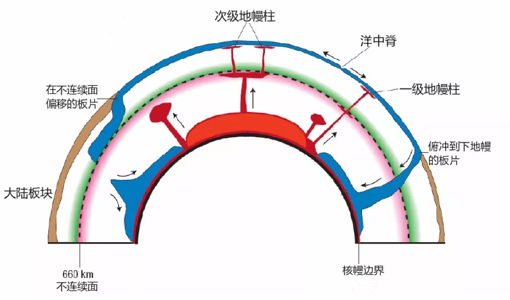 但是,隨著地學家們對地幔對流認識的加深,地幔對流的模型成為了學術界爭論的一個焦點,全地幔對流還是分層對流?結果是地震學、地球動力學的研究傾向于全地幔對流模型,而地球化學研究則支持分層地幔對流。在地下410km到660km是地幔轉換帶,這是上地幔和下地幔的分界面,全地幔對流和分層對流兩種模型爭議的關鍵在于對流是否能穿透地幔轉換帶。