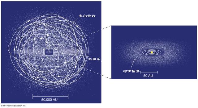因此我們可能會認為太陽系更像是一群蜜蜂一樣,而不是一組漂亮、有序的近乎完美的圓圈。其實這樣想也沒有錯,如果我們遠離太陽系,在行星和小行星之外,在哈雷彗星的軌道之外,在柯伊伯帶之外、甚至在奧爾特云之外,我們就會看到一個凌亂的太陽系。看下圖