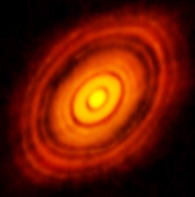 上圖左上方的年輕恒星位于一個星云區域的外圍,距離約450光年,周圍環繞著一個原行星盤。這顆恒星本身只有大約100萬年的歷史。ALMA——“阿塔卡瑪毫米/亞毫米波陣列望遠鏡”,在毫米波段測量了這個原行星盤,并為我們返回了下面的圖像。