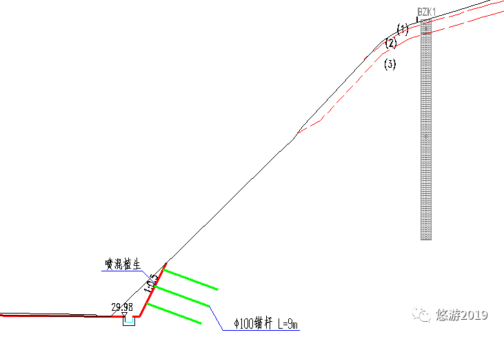 該邊坡若結合實際地質資料進行收坡,邊坡高度由43.1m降低為8.5m,防護工程與挖方規模大幅減小,環境友好性大為提高,優化為斷面如下: