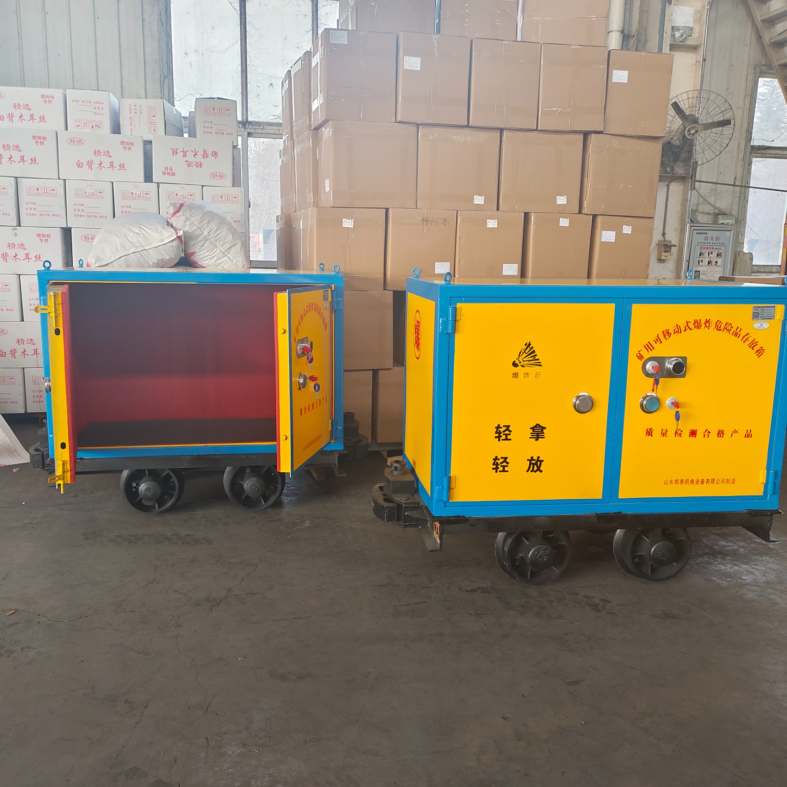 有軌式火工品運輸車,適用于礦山企業運送作業,由礦車和存放柜組合的形式可在井下軌道上推行,或者利用機車牽引,多輛車之間使用插銷,插銷座和三環連來連接,運送安全,大大節省了人力運送的作業強度,也避免了非專業車輛運輸的隱患。