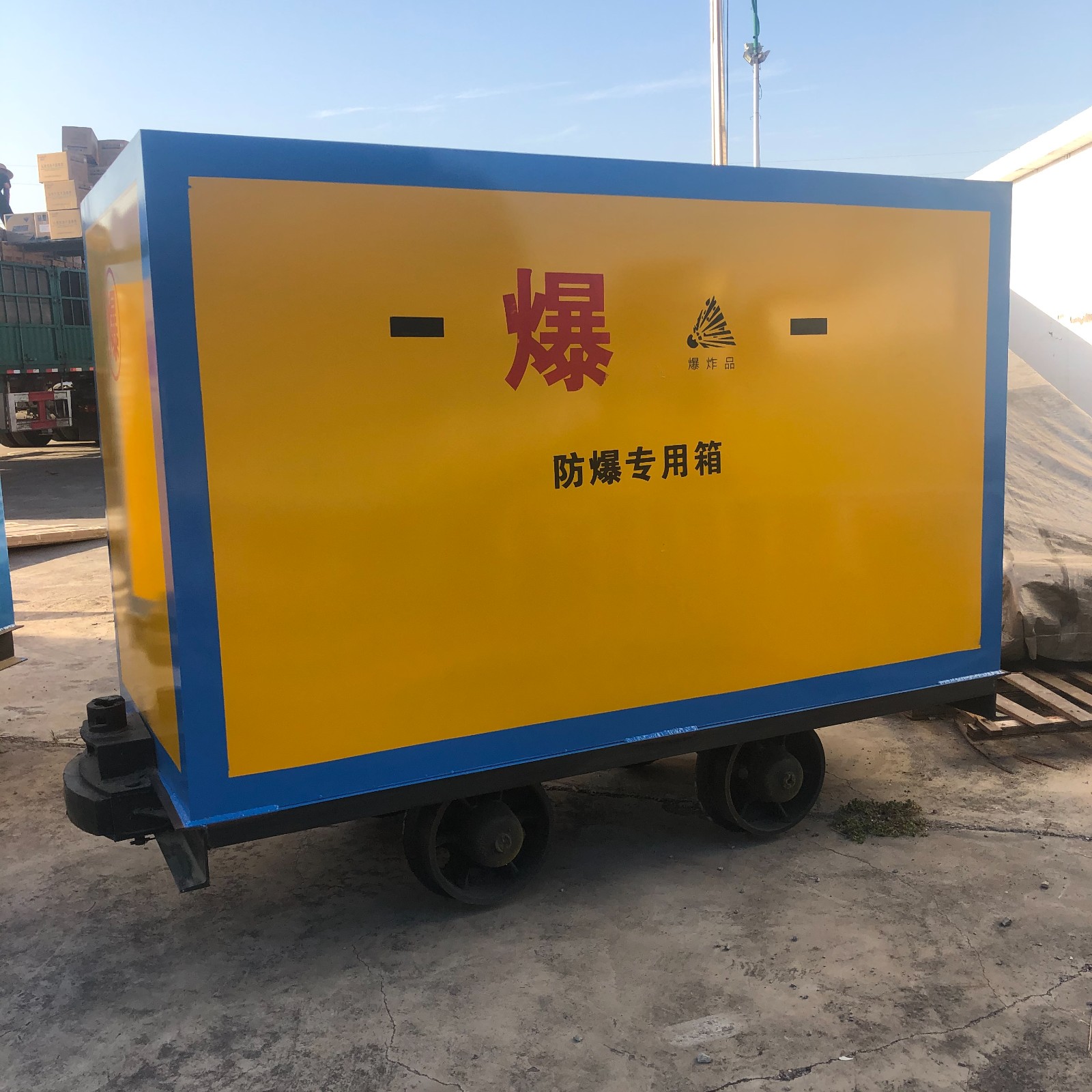 有軌式火工品運輸車,適用于礦山企業運送作業,由礦車和存放柜組合的形式可在井下軌道上推行,或者利用機車牽引,多輛車之間使用插銷,插銷座和三環連來連接,運送安全,大大節省了人力運送的作業強度,也避免了非專業車輛運輸的隱患。