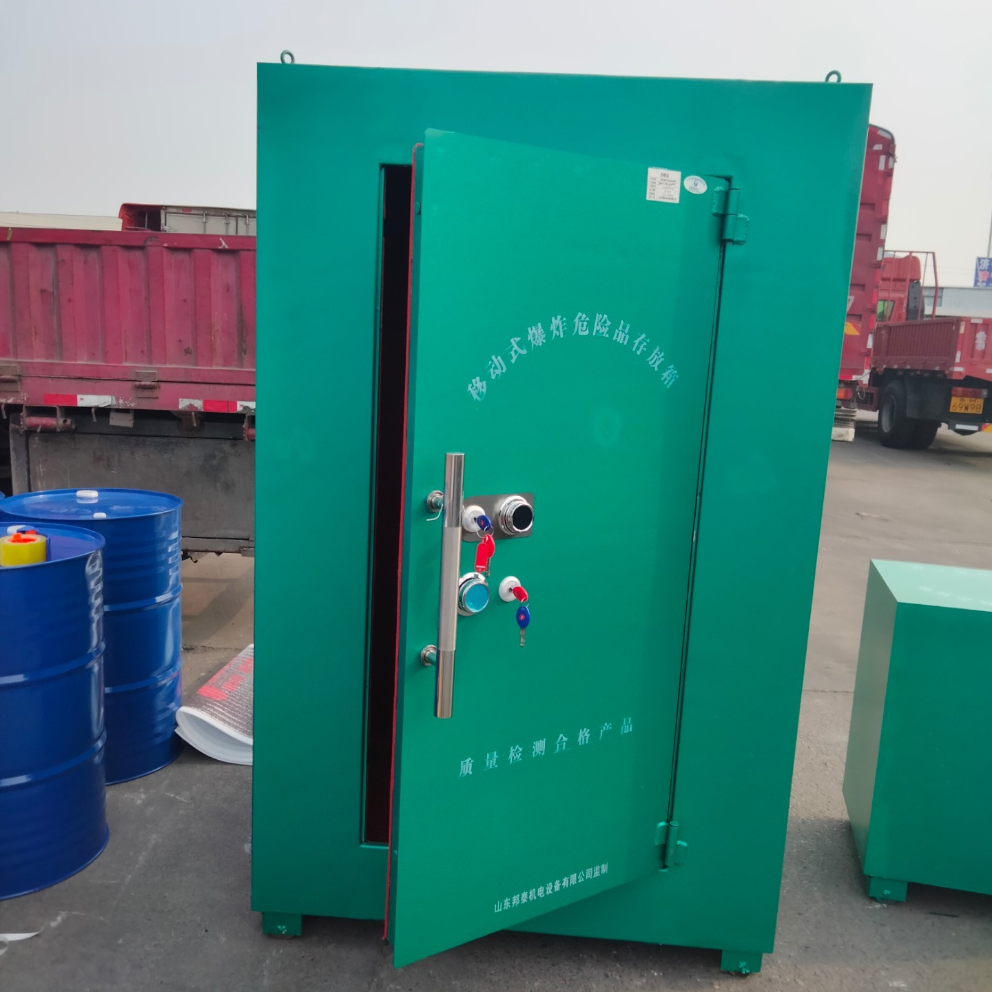 山東邦泰生產的火工品臨時存放庫,主體是由優質鋼板材料焊接而成,國標規格門板鋼板厚度不低于6mm厚,內部為木板內襯和防靜電阻燃氈墊。門扇鎖具為雙鎖聯動式,并安裝有一個機械密碼鎖,有效防盜,存放更安全。