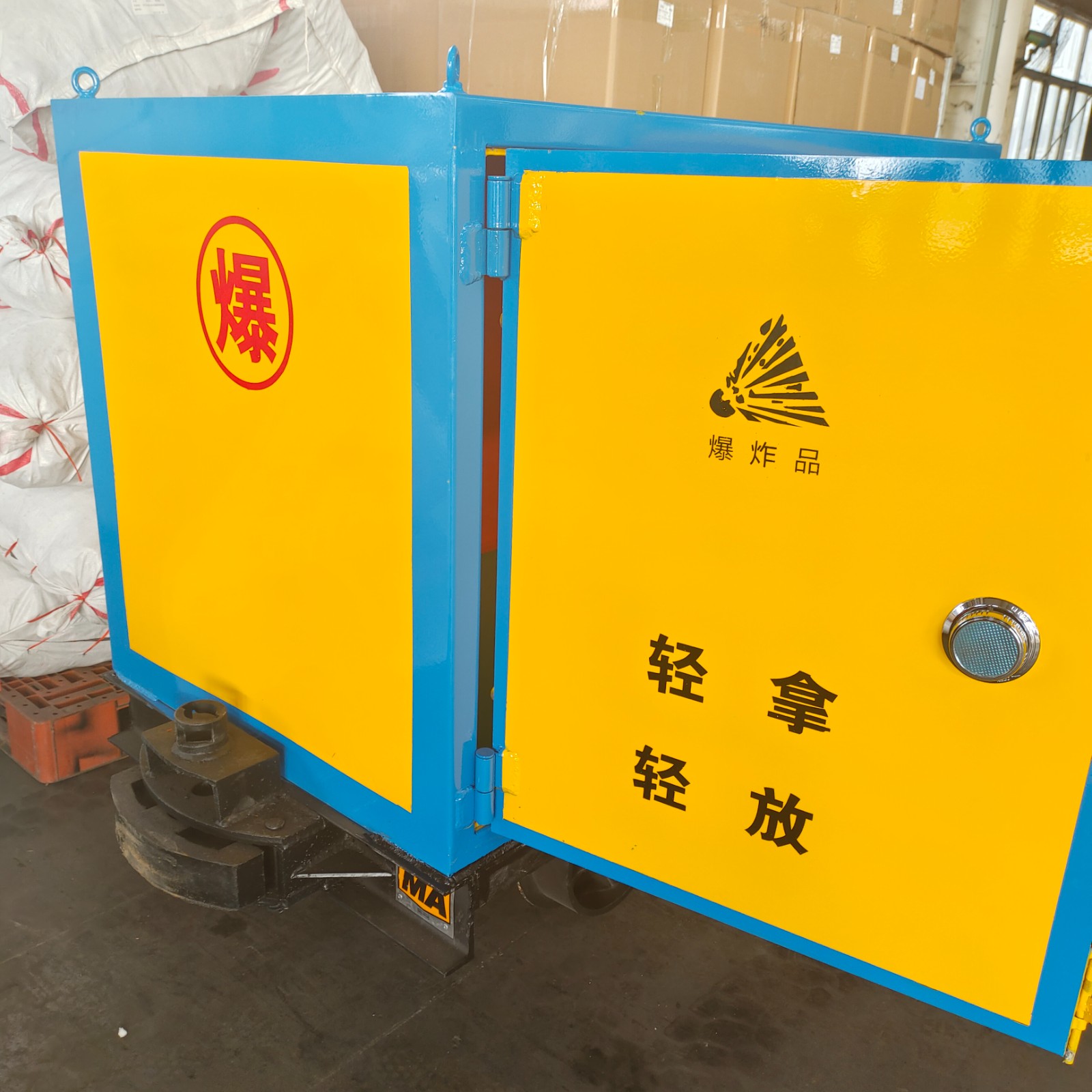 有軌式運輸爆破物品的車輛要求具有防爆,防靜電,防撞擊,防盜等特性,材質(zhì)上要求更高,由6-8mm加厚鋼板焊接而成,內(nèi)部為防靜電材料(絕緣木板和防靜電阻燃氈墊),規(guī)格可根據(jù)需求靈活定制,需要考慮到所需存放量和礦山實際軌距是多少,開門方式多數(shù)為單側(cè)雙開,存取方便,架構(gòu)穩(wěn)定。