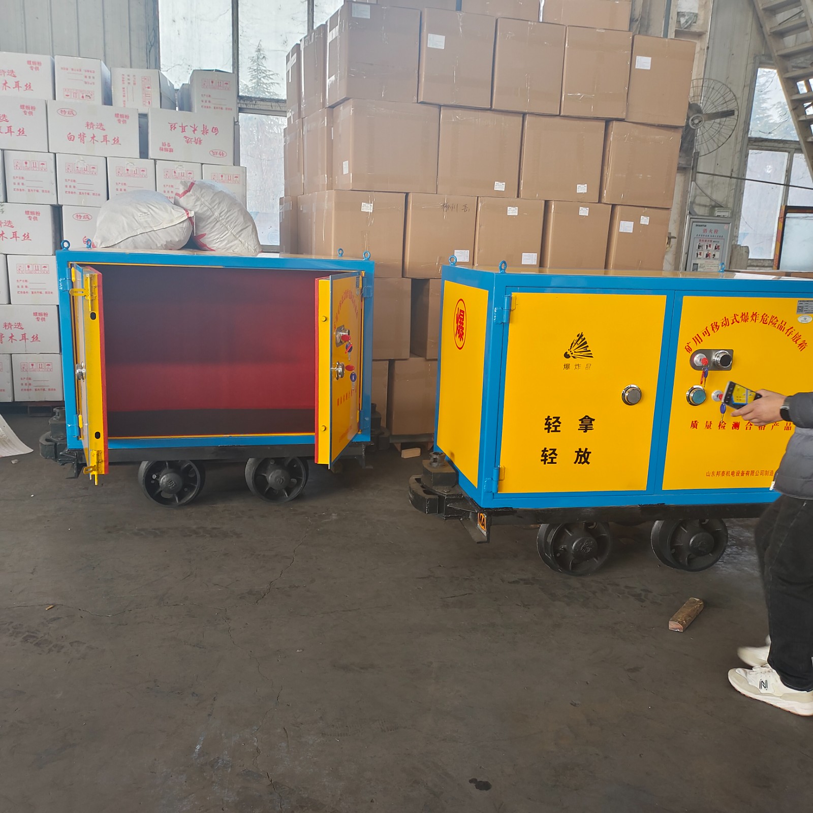 井下礦車式爆破材料運輸箱,顧名思義是一款用于井下運輸爆破危險品的礦車,與普通材料運輸礦車或者運煤礦車不同的是,運輸爆破物品的車輛要求具有防爆,防靜電,防撞擊,防盜等特性,材質上要求更高,使用加厚鋼板焊接而成,板材厚度不低于6mm,內部材料符合防靜電環境,門扇一般設置為雙開門,門板安裝有兩把機械鎖,鑰匙由專人分開保存以保障存放安全。