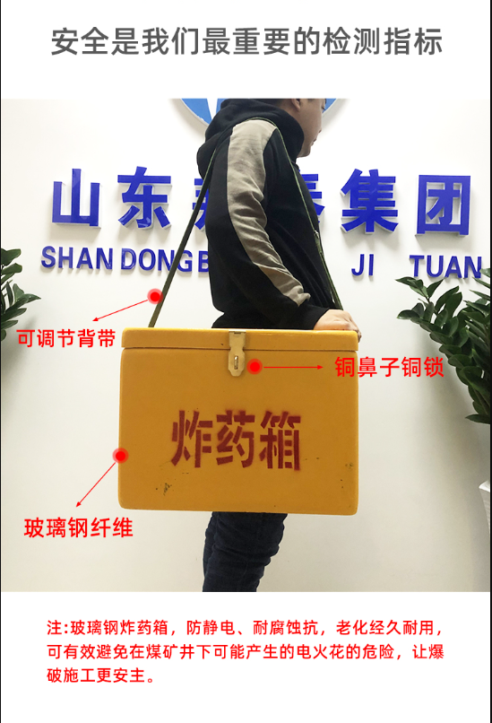 相對于防爆鋼板材質箱、玻璃鋼箱防靜電耐腐蝕、抗老化經久耐用。避免煤礦井下防爆鋼板等金屬材質可能產生的電火花的危險性,使爆破施工作業更安全。