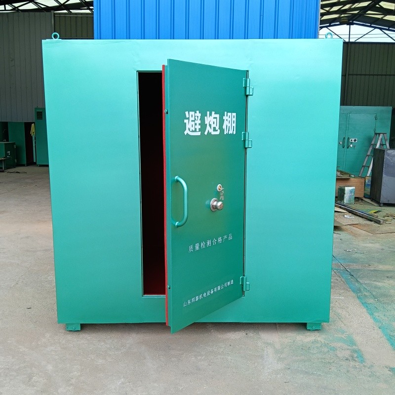 BTJD-001型防爆避炮棚(可移動(dòng)式安全防護(hù)棚),按標(biāo)準(zhǔn)至少需要門板6~10MM厚防爆鋼板可防止大部分的碎石落石沖擊,內(nèi)襯絕緣木板,內(nèi)部鋪設(shè)阻燃防靜電墊,具有抗震抗靜電作用。避炮棚設(shè)置有通氣窗和觀察窗十分方便觀察現(xiàn)場(chǎng)情況。內(nèi)外可開鎖方便人員進(jìn)出設(shè)有通氣孔方便躲避人員呼吸,一面設(shè)有觀察窗方便觀察情況。