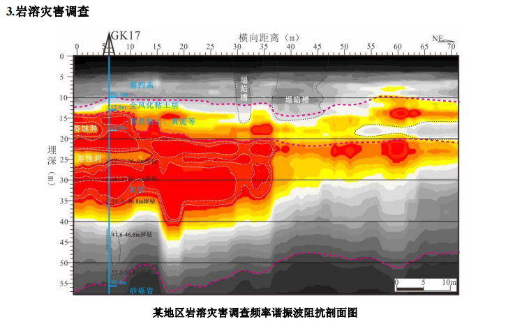 某市發(fā)生地面塌陷現(xiàn)象。應(yīng)用地震頻率諧振勘探技術(shù),發(fā)現(xiàn)灰?guī)r溶蝕的存在導(dǎo)致了以上現(xiàn)象,該成像剖面精細(xì)地描述了第四系塌陷槽、溶蝕洞以及灰?guī)r溶蝕通道的形態(tài)特征。