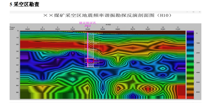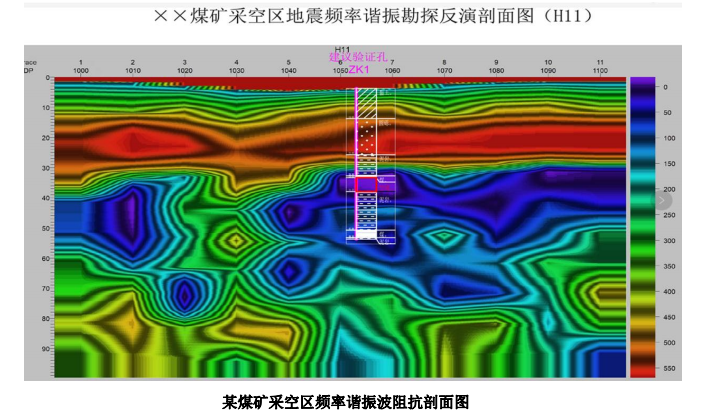 在進(jìn)行高速公路地下勘查中,應(yīng)用頻率諧振勘探技術(shù)在地下 40-50 米發(fā)現(xiàn)兩處異常處(波阻抗值偏低),經(jīng)鉆井證實(shí)為煤礦采空區(qū)。