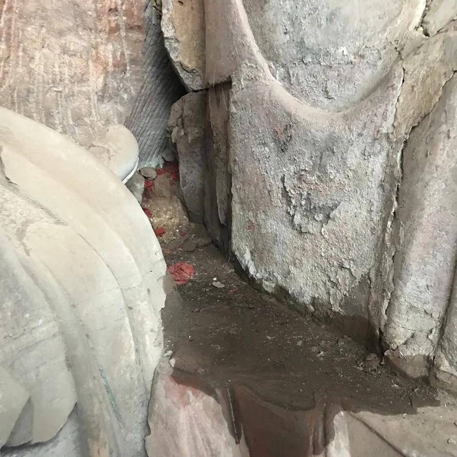 隨著歷史的演變和自然因素的影響,該石窟的保存現(xiàn)狀已不容樂觀,主要表現(xiàn)為崖壁巖石存在殘缺、片狀剝落等病害,造像區(qū)存在滲水、空鼓、潮解、滋生苔鮮等多種水害現(xiàn)象,嚴(yán)重影響了石像的完整性、穩(wěn)定性及藝術(shù)性。