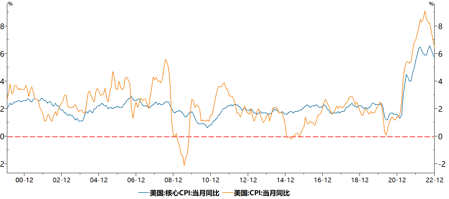 2022年,美國罕見7次加息,美國聯邦基金利率從0-0.25%快速上升至4.25-4.5%。到2022年四季度,市場預期美國加息進程將逐漸放緩,今年7-11月,美國四次加息均為75個基點,到12月放緩至50個基點,預計到2023年繼續放緩。目前美國10年期國債收益率已持續下行數月,美國加息參考的CPI和核心CPI也連續下行,為美聯儲放緩加息提供了支撐。美元指數已自高點114.78回調至102附近,美元指數與商品具有長期的負相關性。