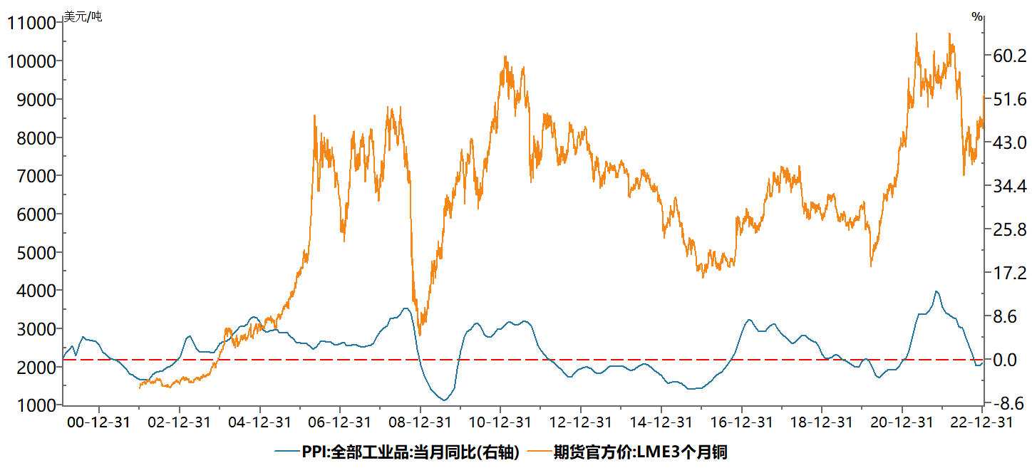 2021年以來,中國的工業品出廠價格指數PPI與國外的高通脹背道而馳,處于持續下行之中。2022年10-11月,連續兩個月負增長1.3%。2022年12月是本輪下行期的首次回升。在歷史上,我們通常可以看到中國礦產品價格變化與PPI之間的同步同向關系。