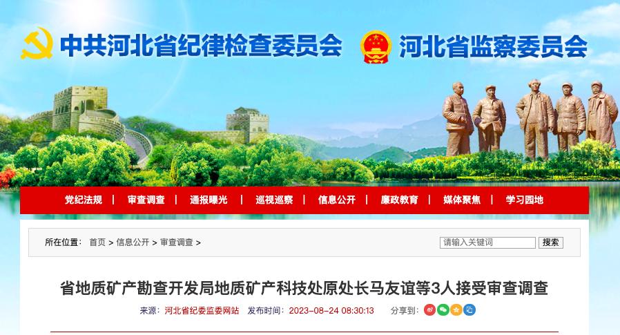 8月24日,河北省紀委監(jiān)委通報,河北省地質(zhì)礦產(chǎn)勘查開發(fā)局(以下稱“河北省地礦局”)地質(zhì)礦產(chǎn)科技處原處長馬友誼、省地質(zhì)礦產(chǎn)勘查開發(fā)局第三地質(zhì)大隊(河北省張承地區(qū)生態(tài)環(huán)境保護與修復(fù)技術(shù)創(chuàng)新中心)副隊長劉月東、中國地質(zhì)環(huán)境監(jiān)測院人事處處長李志強涉嫌嚴重違紀違法,目前正接受省紀委監(jiān)委紀律審查和監(jiān)察調(diào)查。