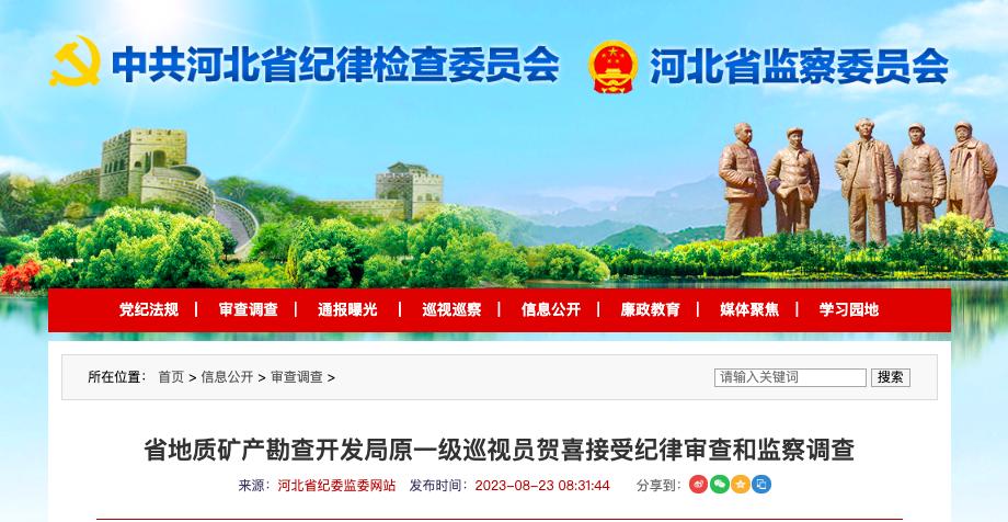 8月23日,河北省紀委監(jiān)委通報,河北省地礦局原一級巡視員賀喜涉嫌嚴重違紀違法,目前正接受省紀委監(jiān)委紀律審查和監(jiān)察調(diào)查。