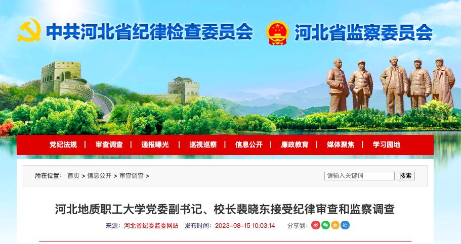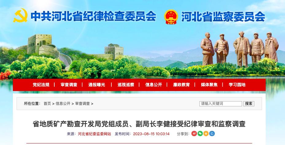 8月15日,河北省紀委監(jiān)委通報,河北省地礦局黨組成員、副局長李健,河北地質(zhì)職工大學(xué)黨委副書記、校長裴曉東涉嫌嚴重違紀違法,目前正接受省紀委監(jiān)委紀律審查和監(jiān)察調(diào)查。河北省地礦局官網(wǎng)顯示,河北地質(zhì)職工大學(xué)系該局局屬單位。