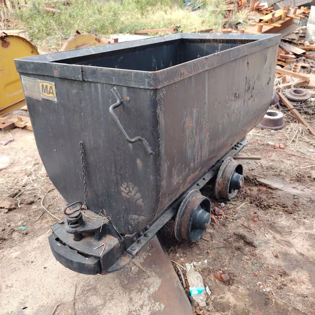 MGC1.1-6固定式礦車車箱與車架固定聯接,須用翻車機將礦車翻轉卸載。其基本組成為車箱、車架、緩沖器、聯接器和行走機構。車架為一金屬結構,能承受牽引力、制動力、礦車之間的碰撞力和鋼軌沖擊力緩沖器裝在車架兩端,用以緩和兩車之間的沖擊力。聯接器是聯接機車和礦車的部件,常用的有插銷鏈環和回轉鏈,大型礦車采用兼具緩沖器作用的自動車鉤。行走機構是由4個車輪和2根軸組成的兩個輪對。礦車和物料的總和超過20噸時,一般應增加輪對數目。對多于兩個輪對的礦車,為便于通過彎道將兩個輪對組成一個有轉盤的小車,這種小車稱為轉向架。