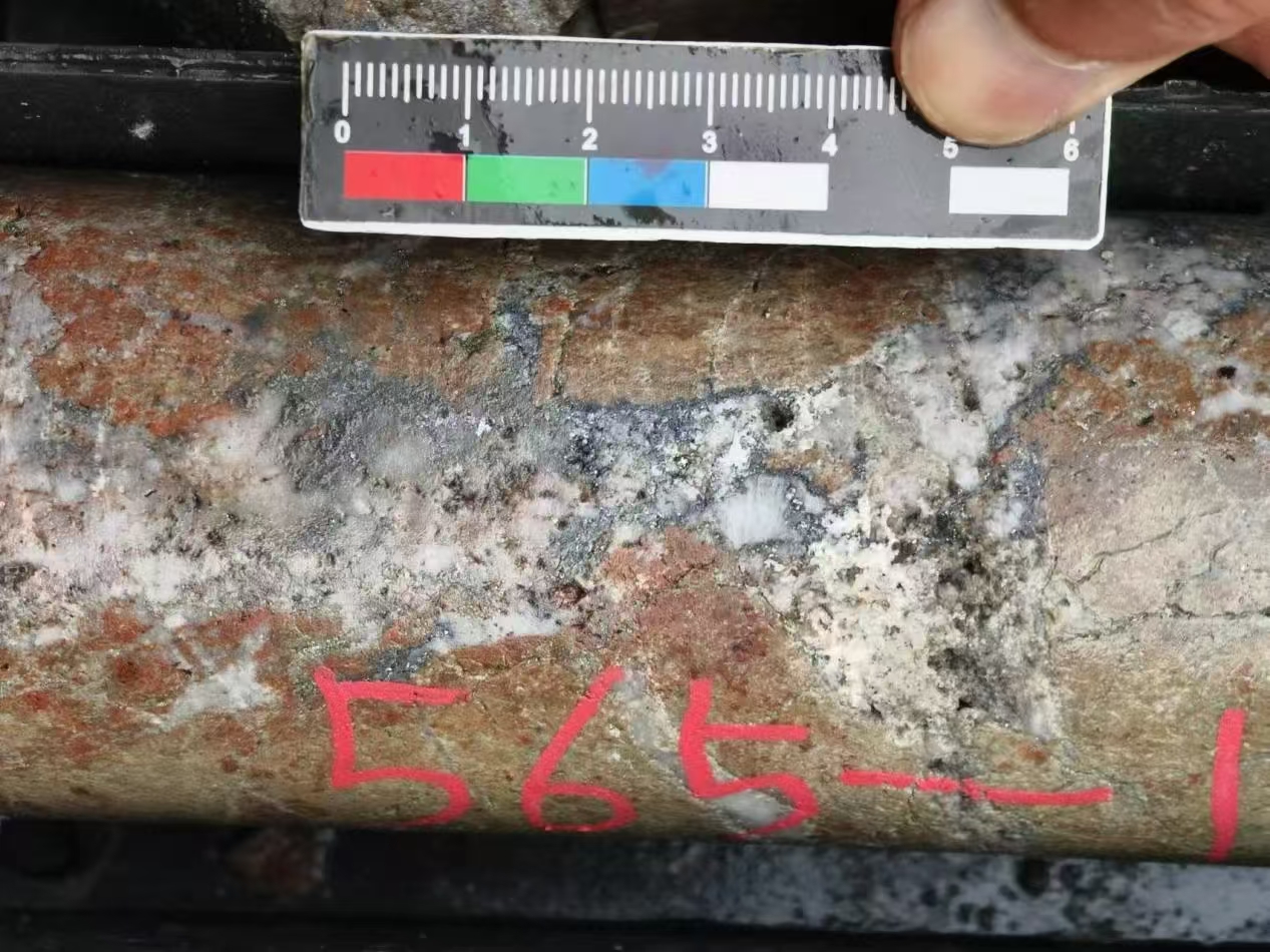 圖為拍攝于巡馬道斷裂ZK2鉆孔中地下1000米以下揭露到的多金屬硫化物礦化的蝕變巖型金礦體巖芯