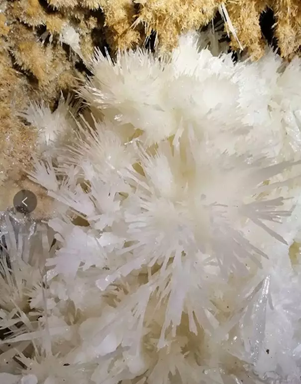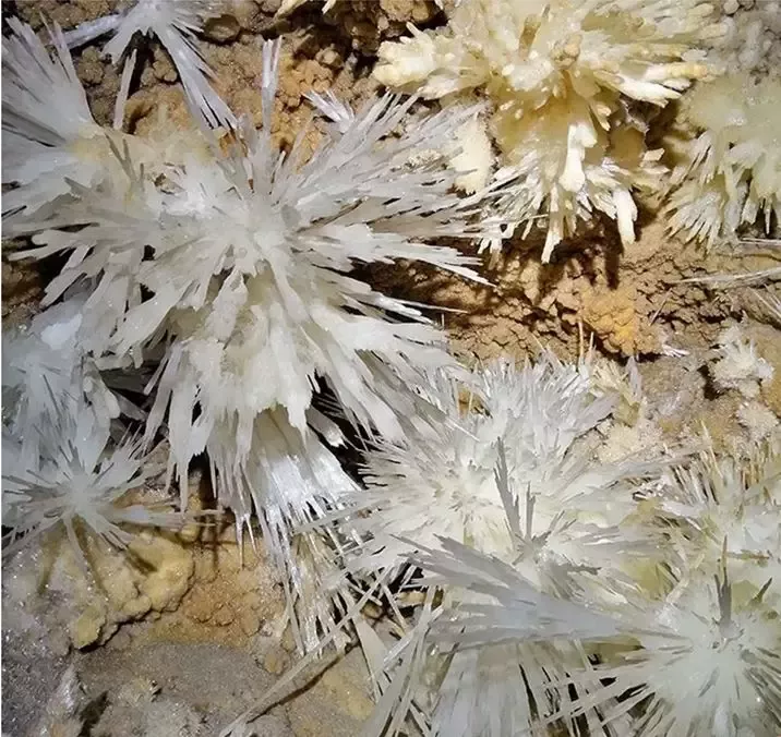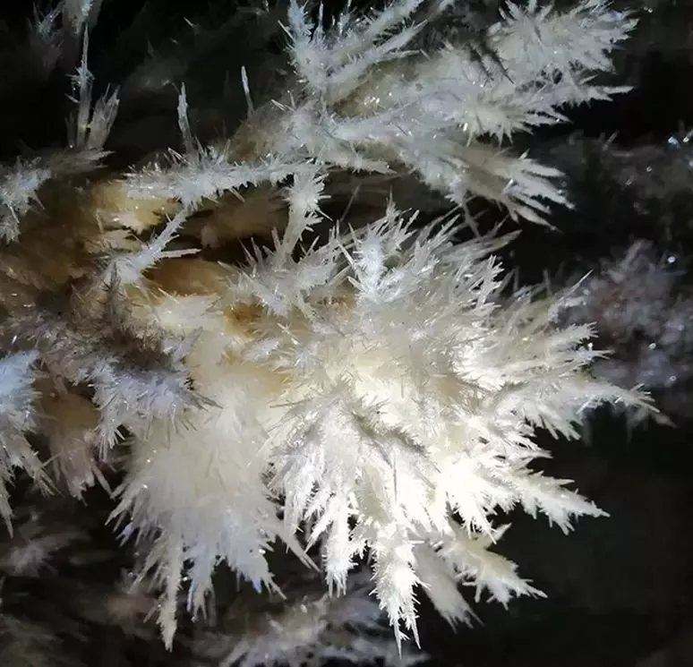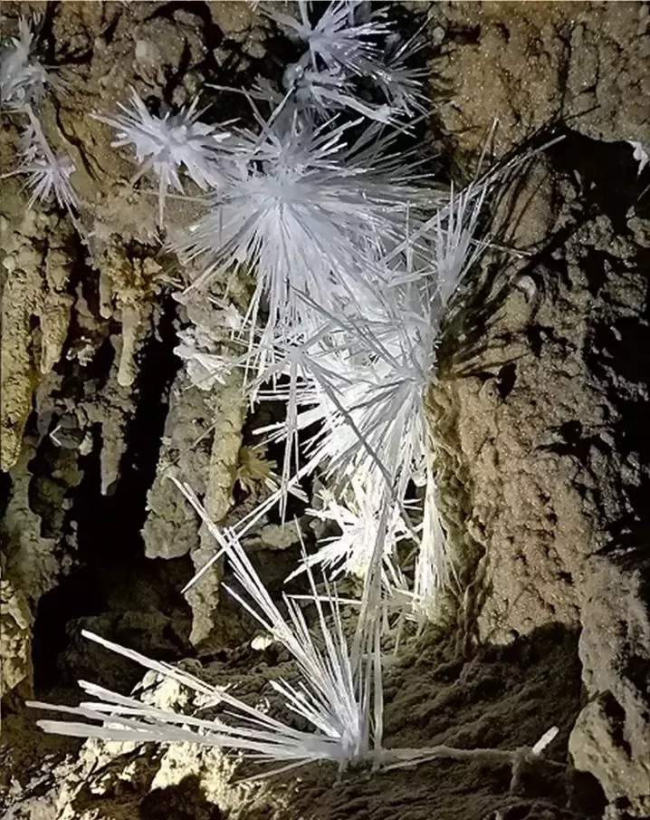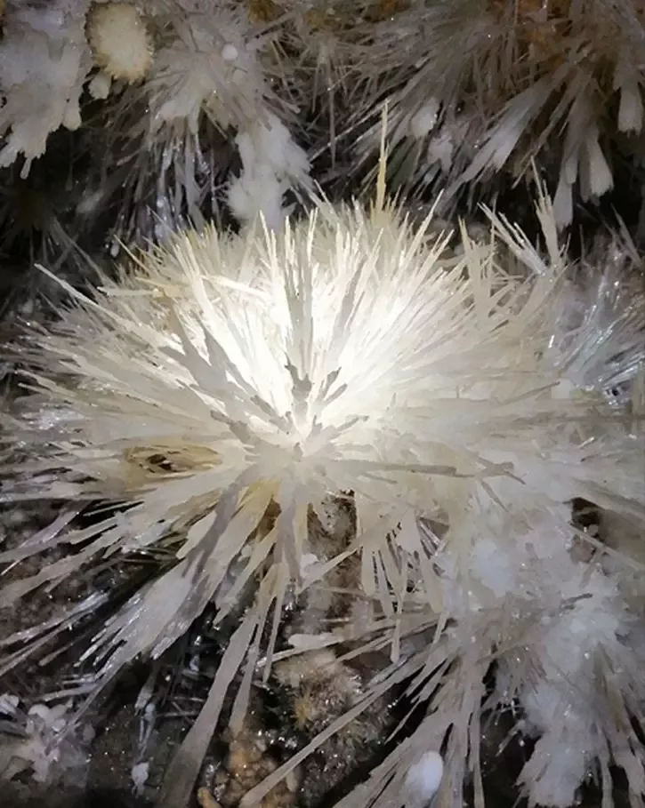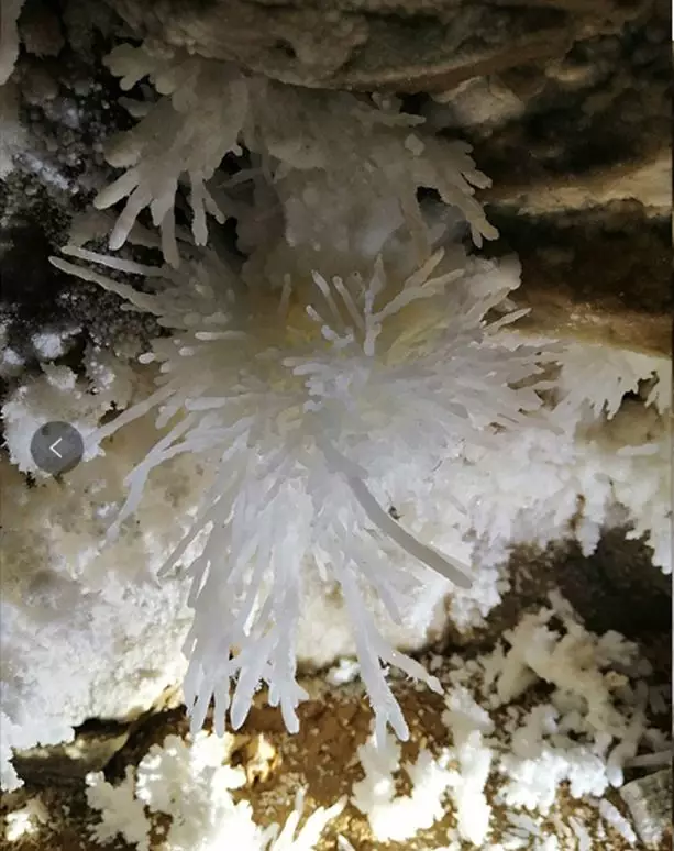 銅仁晶洞宮位于貴州省銅仁市九龍洞溫泉附近的錦江左岸,系2018年4月修建渝懷鐵路復線時偶然發現,近日在網上曝光,頓成網紅。專家實地考察,晶洞宮已勘察兩層洞道,上層約600米,下層約100米。基巖地層應為寒武系白云巖,晶體類型多樣,琳瑯滿目,千姿百態。主要發育文石、方解石、石膏三大類晶體,分布面積約1500平方米。晶體形態有球狀、花狀、枝狀、絮狀、針狀、管狀、柱狀、放射狀、卷曲狀、幕簾狀等十余種,令人驚艷,為國內少見。現根據網上資料,從旅游地學科普與審美角度,初步歸納、整理如下,供大家分享。