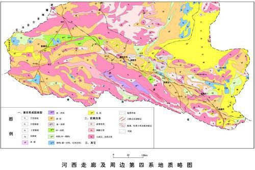 關于河西走廊的地質成因有兩種解釋:槽臺學說認為,河西走廊屬祁連褶皺系走廊過渡帶;板塊構造學說認為,屬塔里木-中朝板塊陸緣活動帶。河西走廊四周受區域性深大斷裂的限制,北部為寬灘山-合黎山-龍首山斷裂帶,南為祁連山北緣斷裂帶,西為阿爾金走滑斷裂帶,東為鄂爾多斯西緣斷裂帶。從地貌形態上看,河西走廊夾峙在祁連山、阿爾金山與馬鬃山、合黎山、龍首山等山脈之間,東起烏鞘嶺,西至甘新交界的星星峽,呈東西走向展布,長約1000公里、寬約10公里至100余公里的狹長地帶。