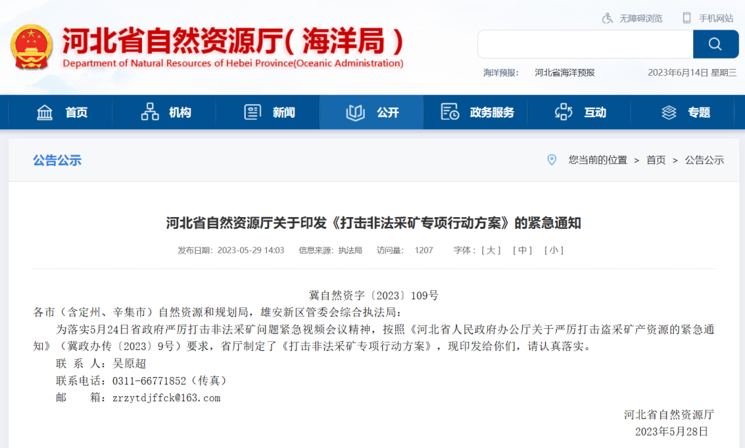2023年5月29日,河北省自然資源廳發布《打擊非法采礦專項行動方案》(冀自然資字〔2023〕109號,以下稱“方案”),要求利用1個月時間,集中查處一批違法違規采礦案件,打擊懲治一批違法分子,修復治理一批非法礦山(礦點),實現礦產資源違法違規問題“動態清零”。
