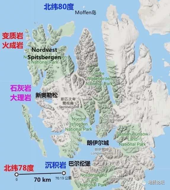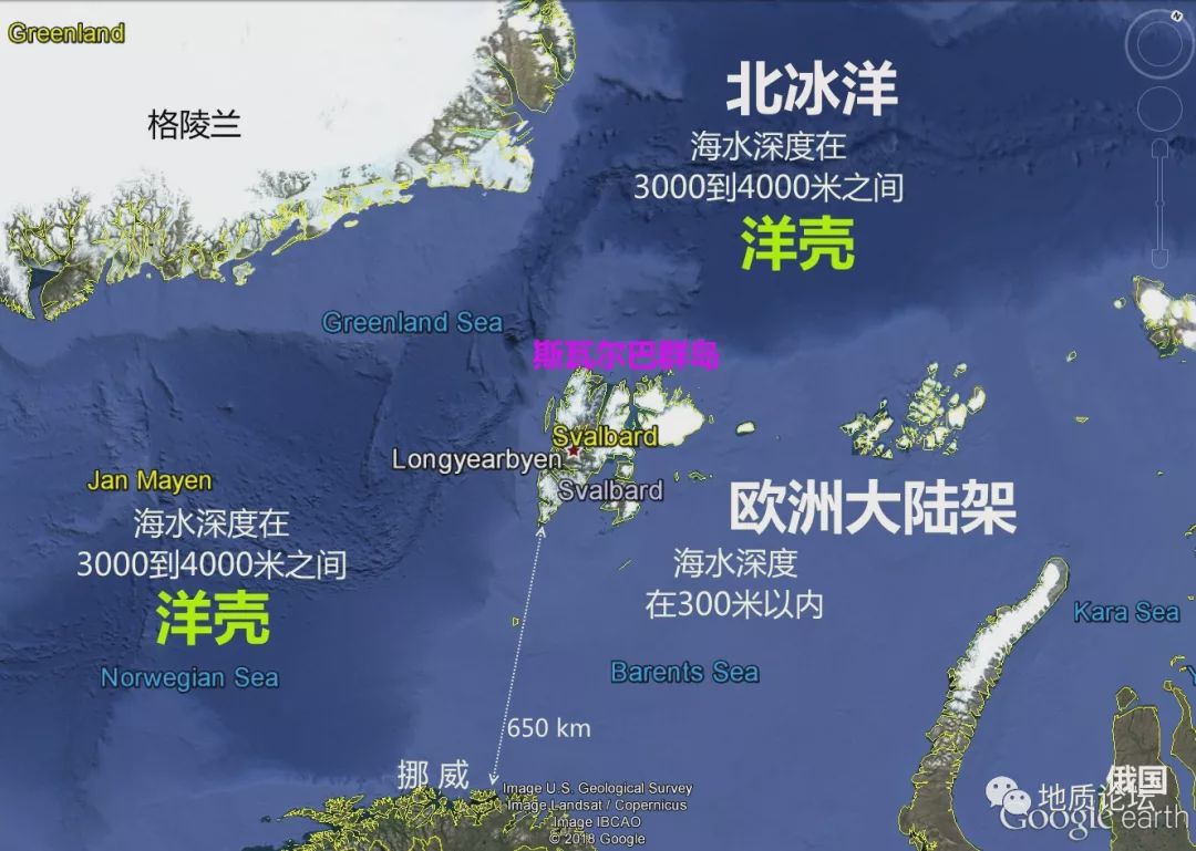 變質(zhì)巖結(jié)晶基底,讓我感到,這里巖石是屬于陸殼巖石。它們是被強(qiáng)烈抬升到四周海平面以上的。再通過(guò)Google地球,可知道,這斯瓦爾巴群島與歐洲陸地連接這斯瓦爾巴群島與歐洲陸地連接的、寬度大于650千米的海水深度在300米以內(nèi)。因此,它們應(yīng)該是屬于歐洲大陸架一部分。群島的西部才是3000到4000米深的深海北極洋洋殼。