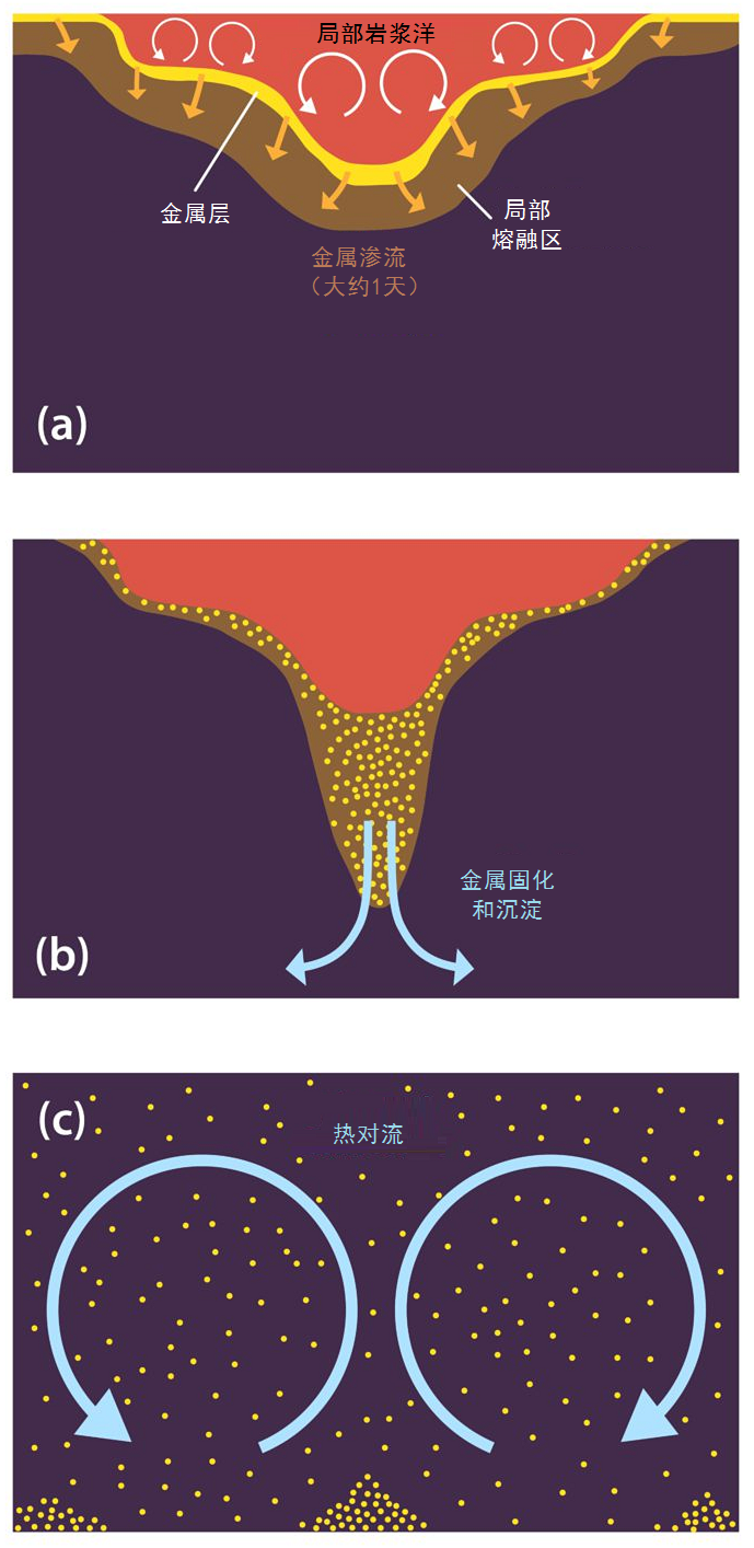 理論的核心是提出地幔存在一層薄的“瞬態”區域,在此處地幔淺部發生熔融,而深部呈固態。研究人員發現,該區域具有獨特的動力學特征,能夠有效地捕虜落下的金屬組分并將它們緩慢地攜往地幔其他部分。