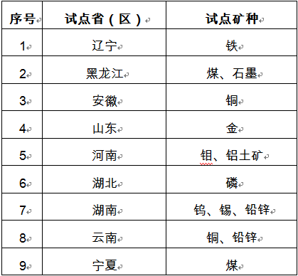 綜合考慮礦種類型、代表性、地區分布和工作需要,選擇遼寧、黑龍江等9個省份對煤炭、鐵礦等12個礦種開展試點工作。